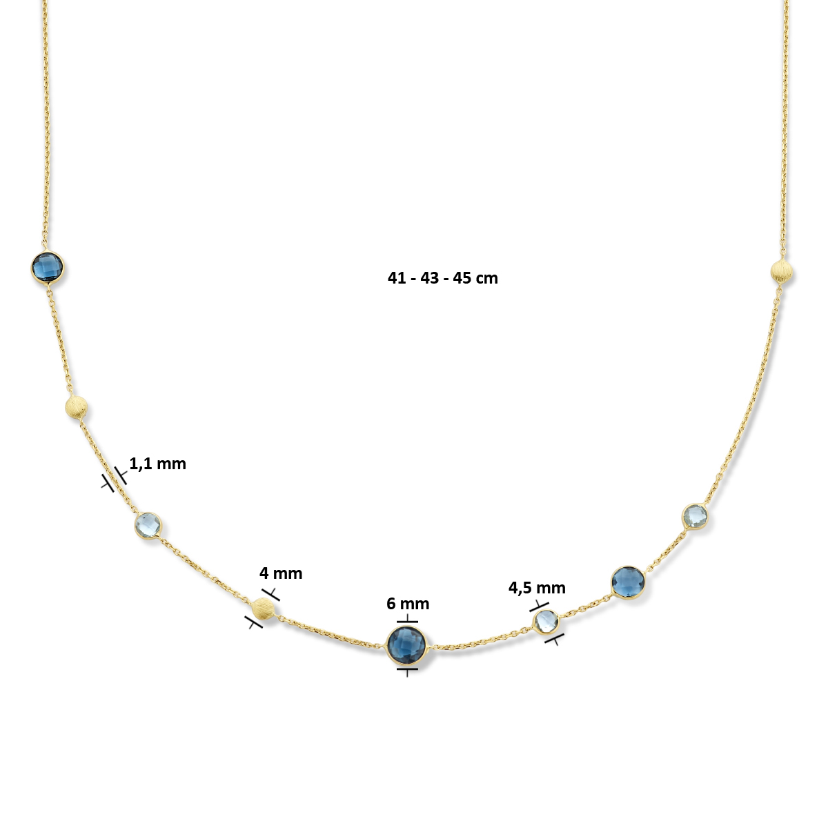 14k Geelgouden collier uitgevoerd met blauw topaas en London blue topaas stenen. Het collier heeft  draaglengtes van 41, 43 en 45cm. De schakelbreedte is 1.1mm.