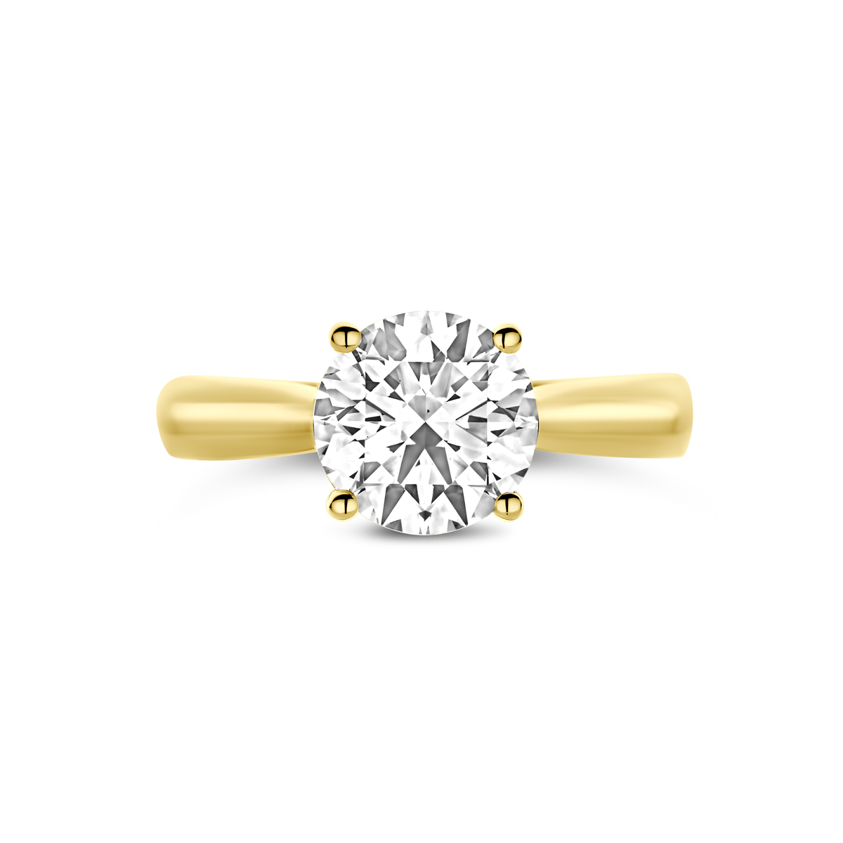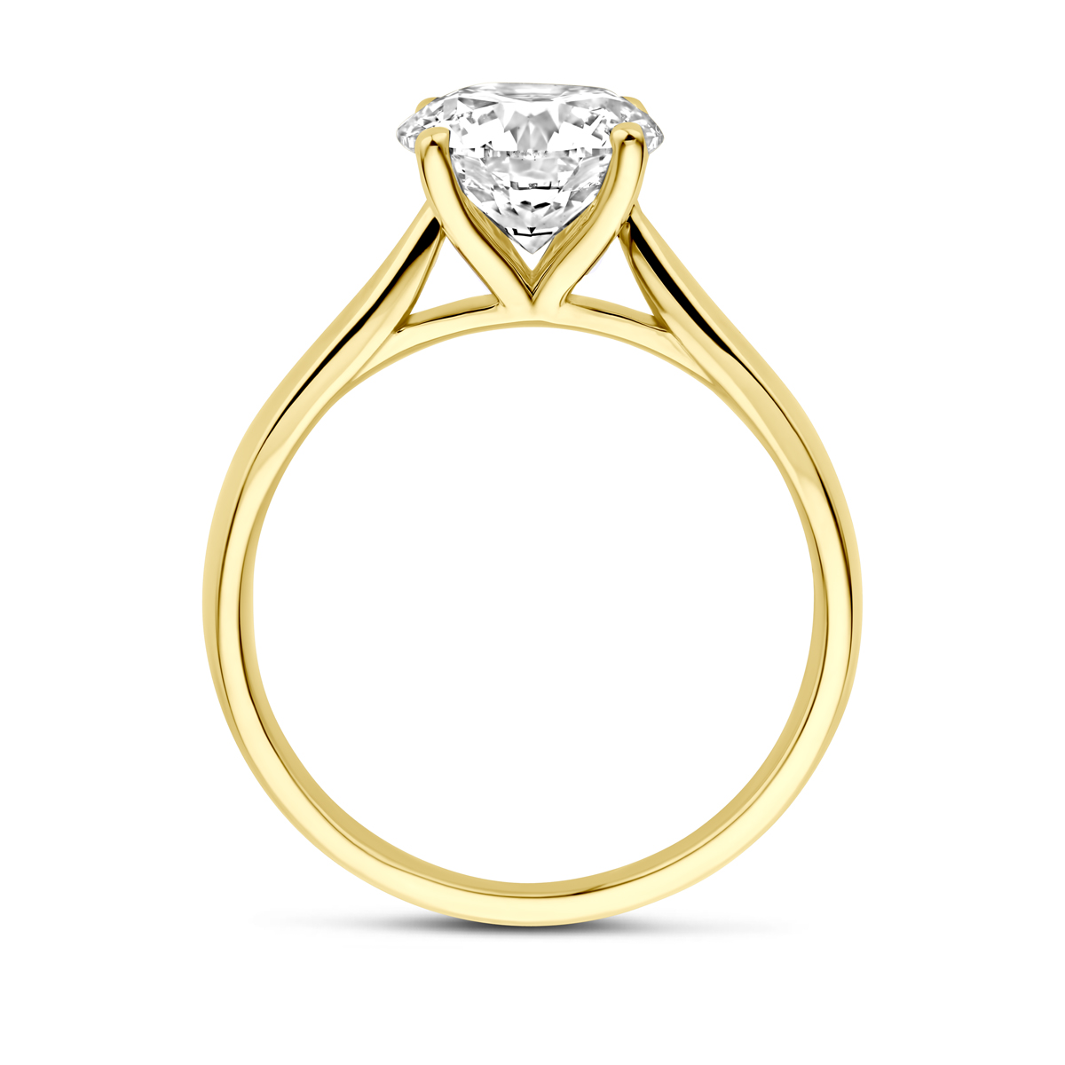 14k Geelgouden ring uitgevoerd met een lab grown diamant met een totaalgewicht van 2.00ct. Lab grown diamanten zijn diamanten die ontstaan in een laboratorium. Onder extreem hoge druk en temperatuur wordt het natuurlijk ontstaansproces nagebootst met als eindresultaat een diamant met dezelfde chemische eigenschappen maar met een andere oorsprong.