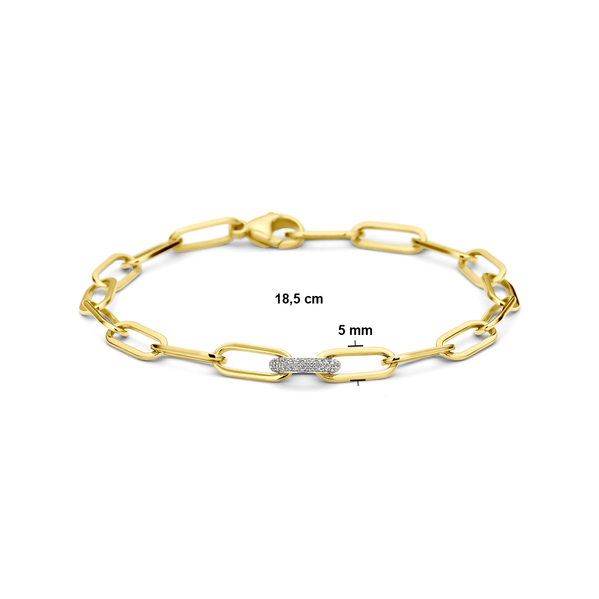 18k Bicolor geel- en witgouden armband met schakelbreedtes van 5 en 7.5mm. Uitgevoerd met diamanten en een karabijn sluiting. De armband heeft een draaglengte van 18.5cm.