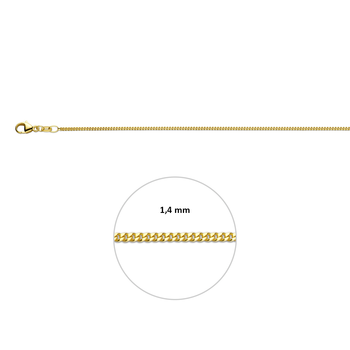 9K lengteartikel met gourmette schakel. De schakelbreedte is 1.4mm.