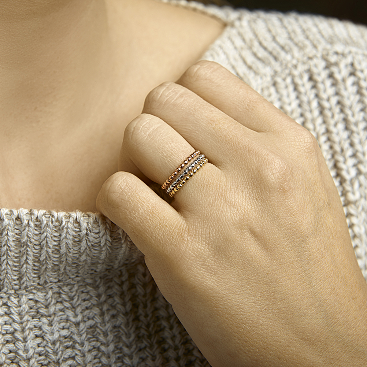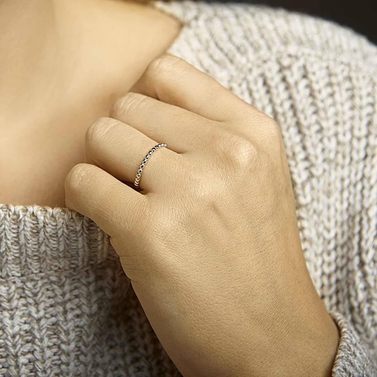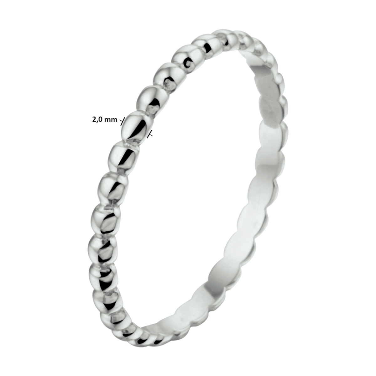 14k Witgouden aanschuifring uitgevoerd met platte bolletjes. De ring heeft een breedte van 2mm.