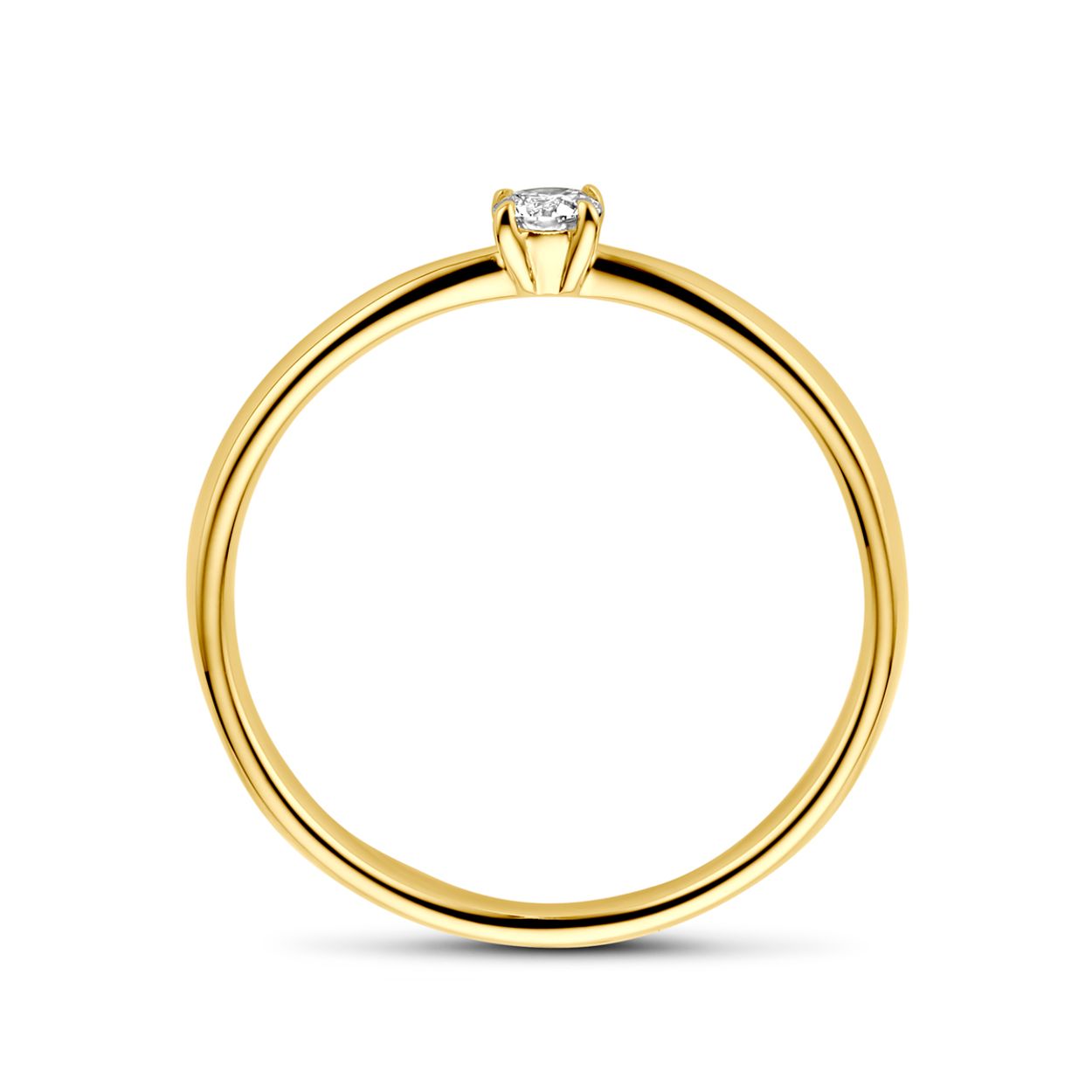 14k Geelgouden aanzoeksring uitgevoerd met diamant. De steenmaat is 3mm en het diamantgewicht is 0.10ct.