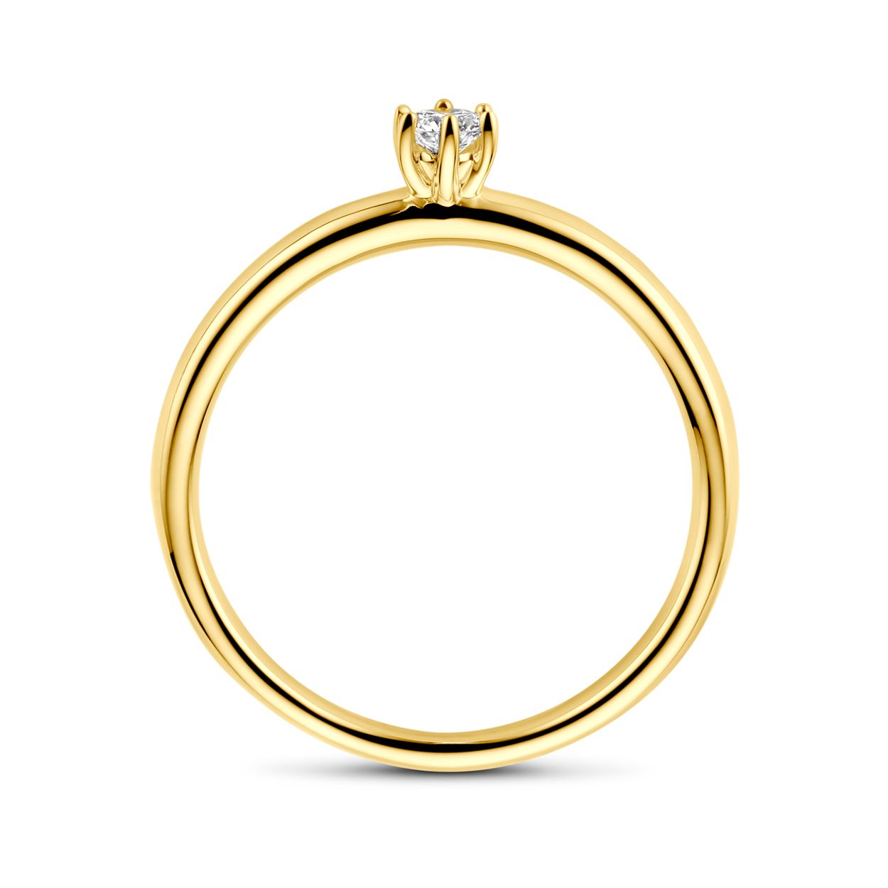 14k Geelgouden aanzoeksring uitgevoerd met diamant. De ring heeft een breedte van 4.5mm. De steenmaat is 3mm en het diamantgewicht is 0.10ct.