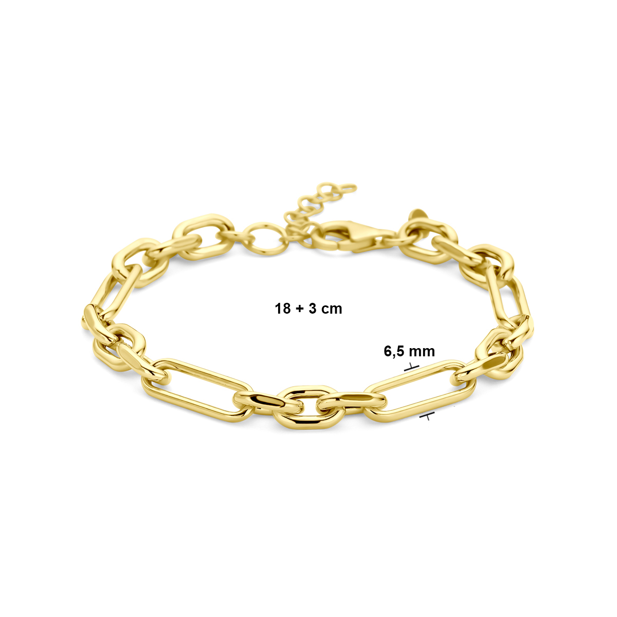 Geelgoud op 925 zilveren anker armband. De armband heeft een draaglengte van 18Cm en een extensie van 3cm. De schakelbreedte is 6.5mm. Uitgevoerd met een karabijn sluiting.;Geen garantie op plating.
