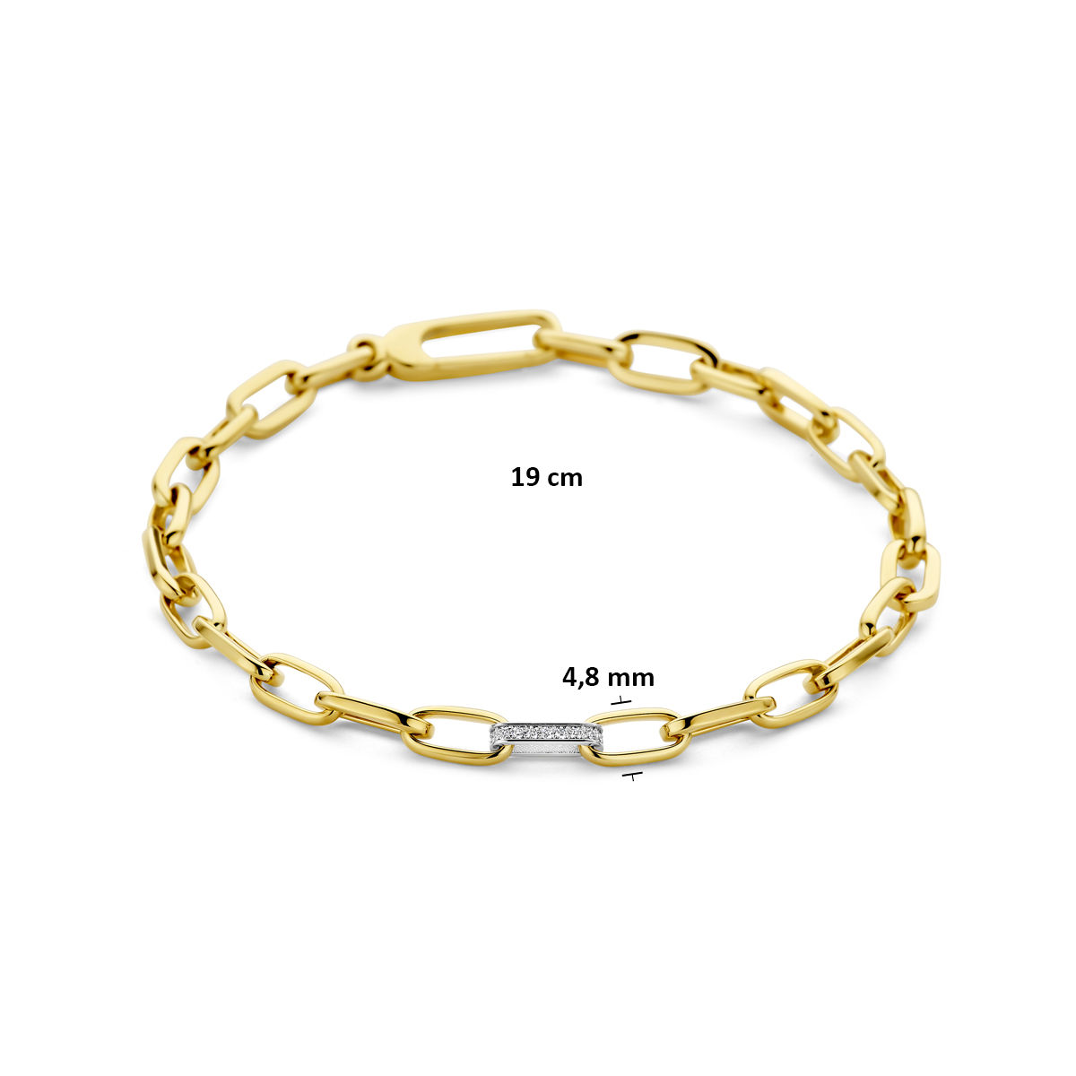 14k Bicolor geel- en witgouden armband uitgevoerd met diamant. De armband heeft een schakelbreedte van 4,8mm en een lengte van 19cm. Het totale diamantgewicht is 0.09ct. Uitgevoerd met een karabijnsluiting.