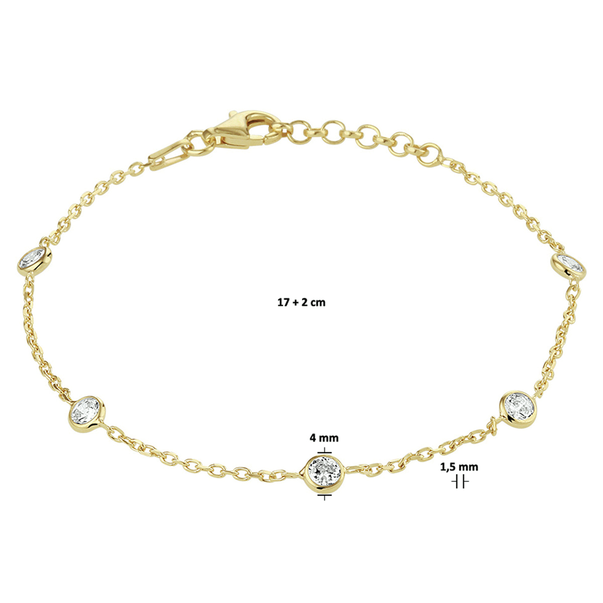 Geelgoud op 925 zilveren armband uitgevoerd met een schitterende zirkonia en een stevige karabijn sluiting. De armband heeft een draaglengte van 17cm met een extensie van 2cm. De schakelbreedte is 1.5mm. Geen garantie op plating.