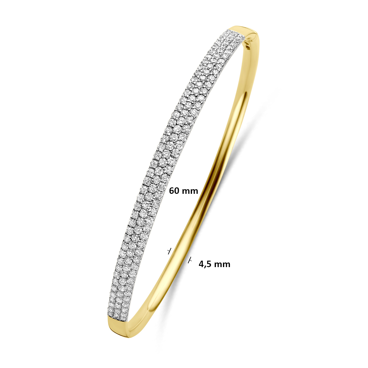 14k Bicolor geel en witgouden bangle uitgevoerd met diamanten. De bangle heeft een afmeting van 4.5x60mm. Het totale diamantgewicht is 1.93ct.