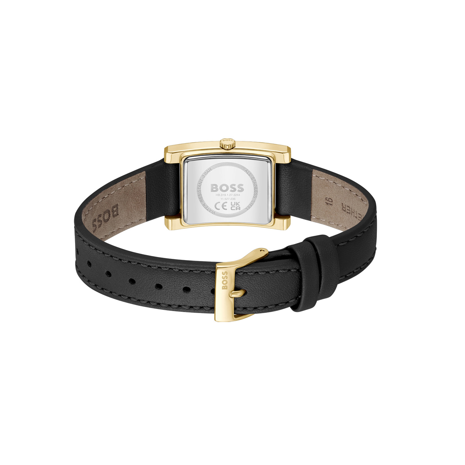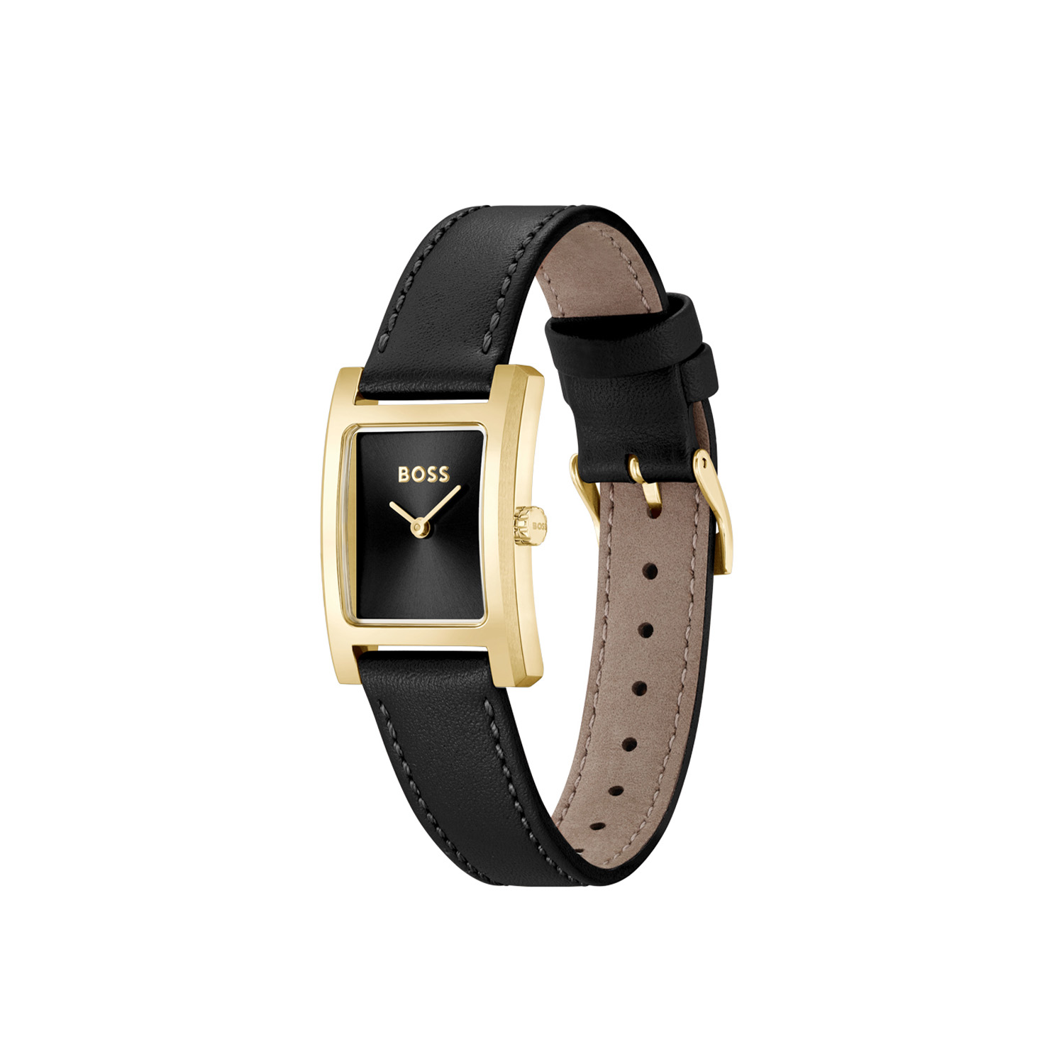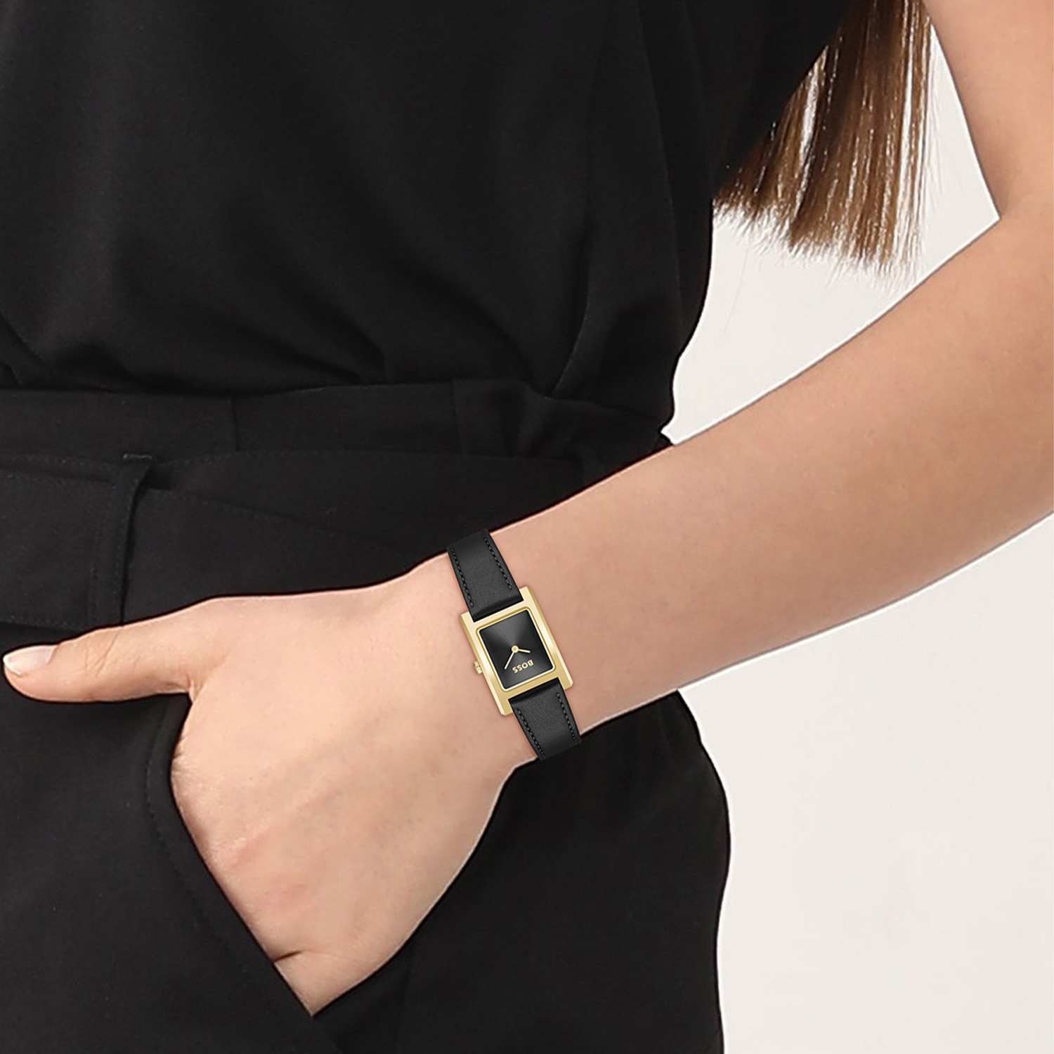 De BOSS HB1502742 LUCY Dameshorloge heeft een rechthoekige, goudkleurige roestvrijstalen kast en een zwart leren band. Het is een analoog, waterbestendig (3 ATM) horloge met een kwartsuurwerk. De luxe uitstraling is perfect voor formele gelegenheden. Draag dit elegante horloge om je pols met formele of zakelijke kleding voor een verfijnde look.