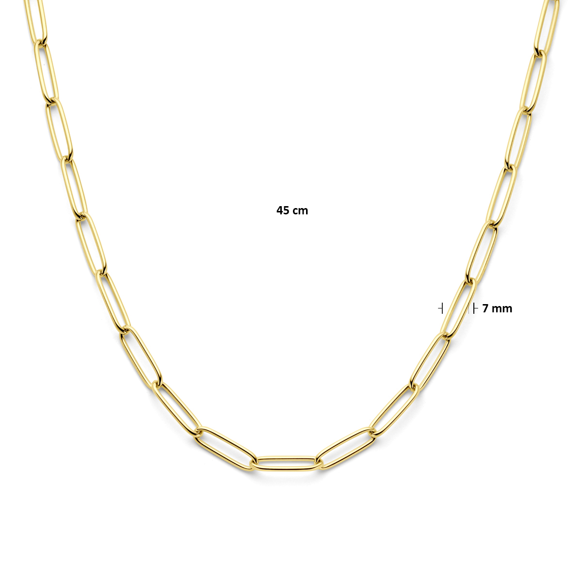 14k Geelgouden collier uitgevoerd met een paperclip schakel van 7mm. Het collier heeft een draaglengte van 45cm en is uitgevoerd met karabijnsluiting.