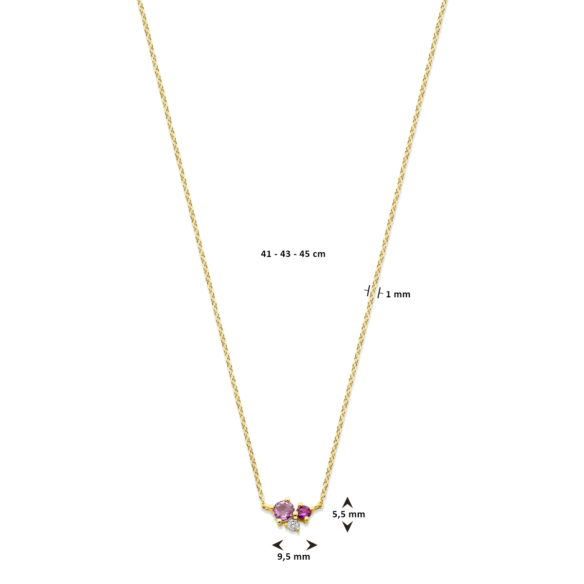 14k Geelgouden collier uitgevoerd met roze saffier en diamant. Het collier heeft draaglengtes van 41-43-45. De totale diamantgewicht is 0.03ct. Uitgevoerd met karabijnsluiting.