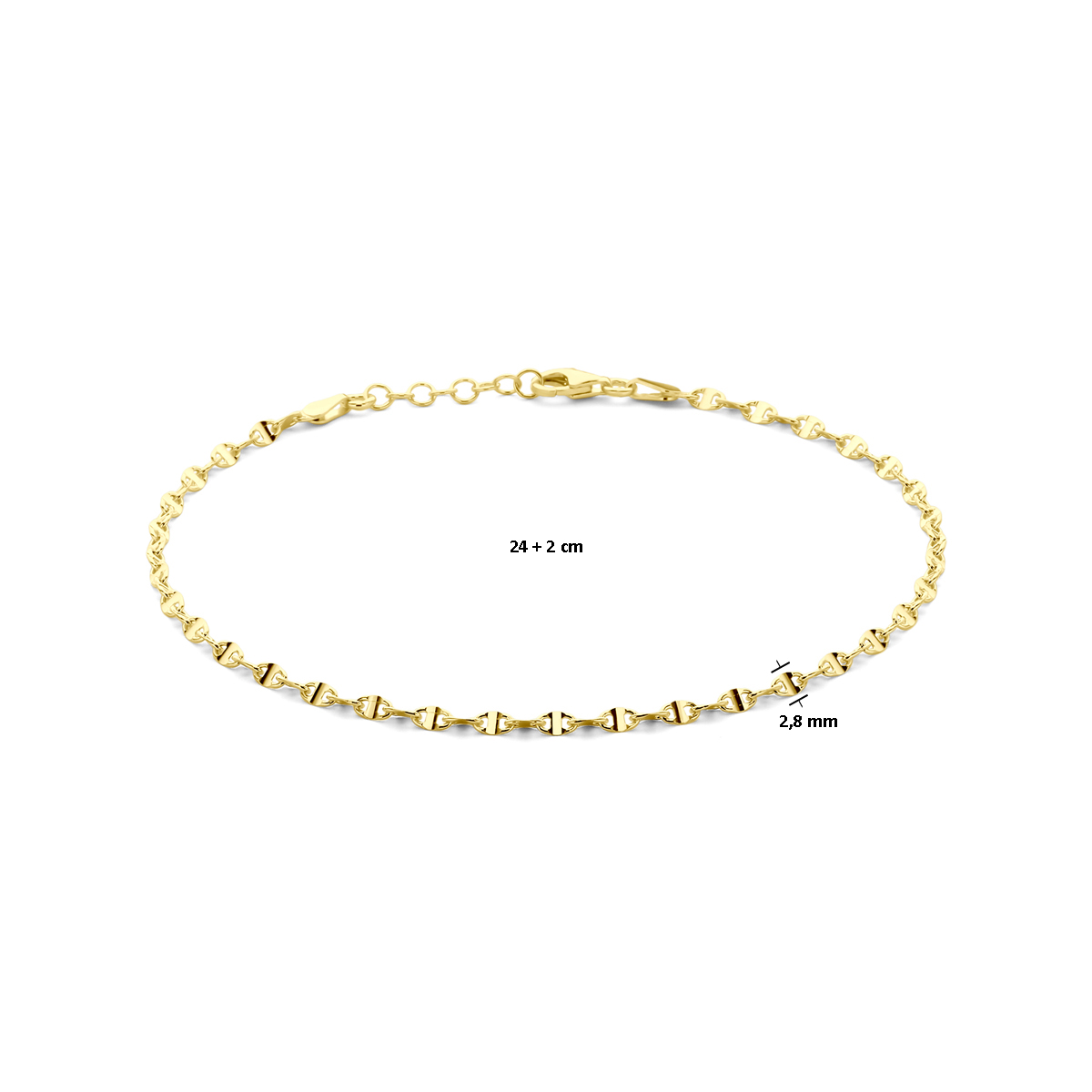 Verguld op 925 zilveren enkelbandje met een draaglengte van 24cm en een extensie van 2cm. De schakelbreedte is 2.8mm. Geen garantie op de plating.