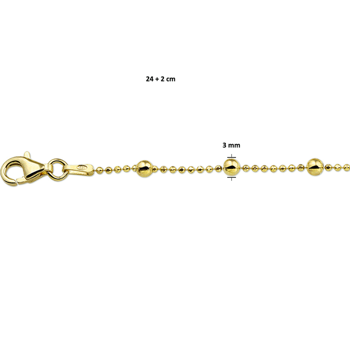 Trendy verguld op zilveren bolletjes enkelbandje met een draaglengte van 24cm en een extensie van 2cm. Het enkelbandje is uitgevoerd met een stevige karabijn sluiting. Minimalistisch design voor een exclusieve uitstraling. De schakelbreedte is 3.0mm. Geen garantie op plating.