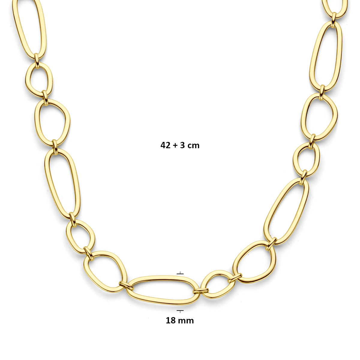 14k Geelgouden collier met een schakelbreedte van 18mm. Het collier heeft een draaglengte van 42cm met 3cm extensie en is uitgevoerd met karabijnsluiting.
