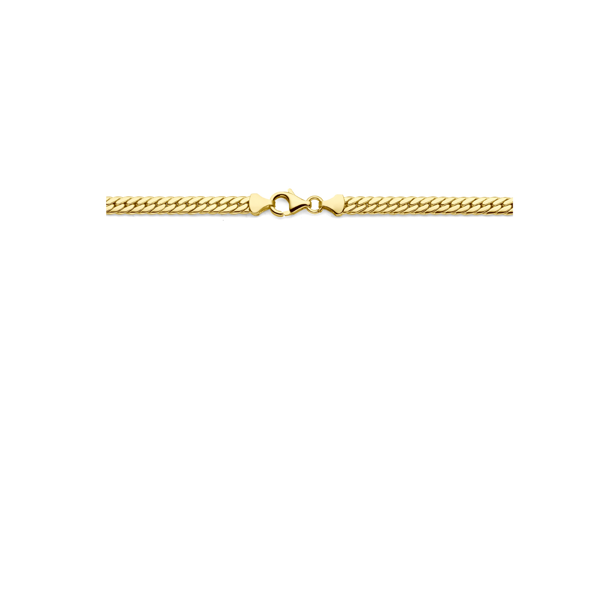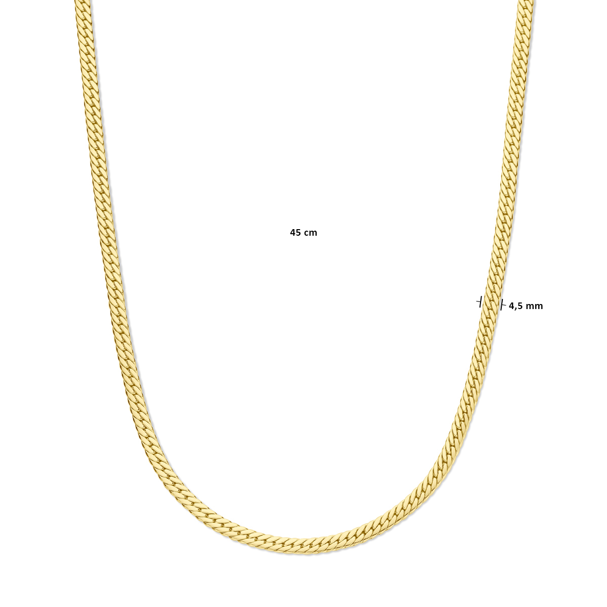14k Geelgouden collier met een gourmette schakel van 4.5mm. Het collier heeft een draaglengte van 45cm en is uitgevoerd met karabijnsluiting.