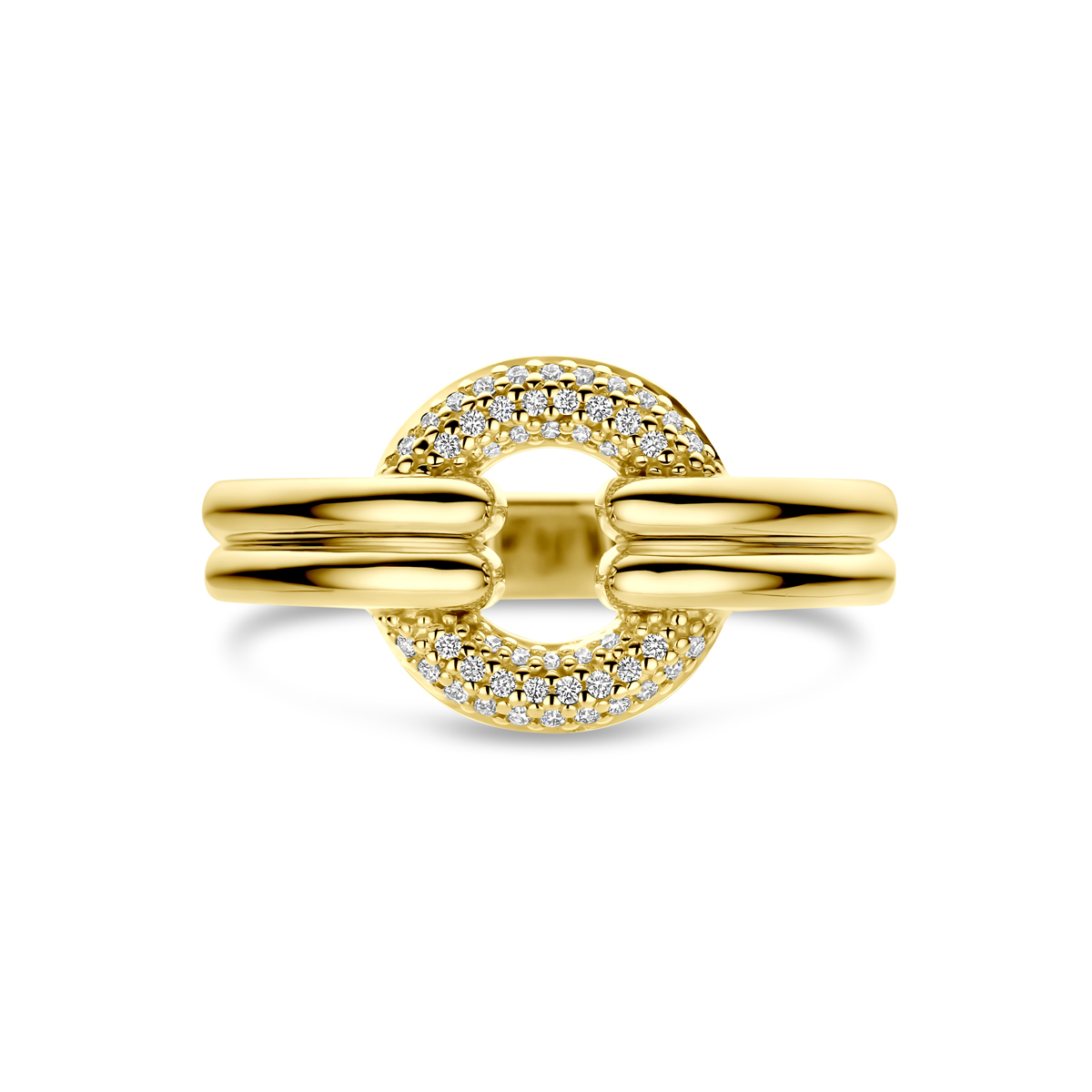 14k Geelgouden ring uitgevoerd met diamant. De ring heeft een breedte van 12mm. Het totale diamantgewicht is 0.13ct.
