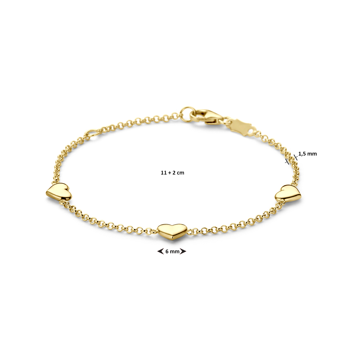 14k Geelgouden armband uitgevoerd met hartjes. De armband heeft draaglengtes van 11-13 cm en een schakelbreedte van 1,5 mm.