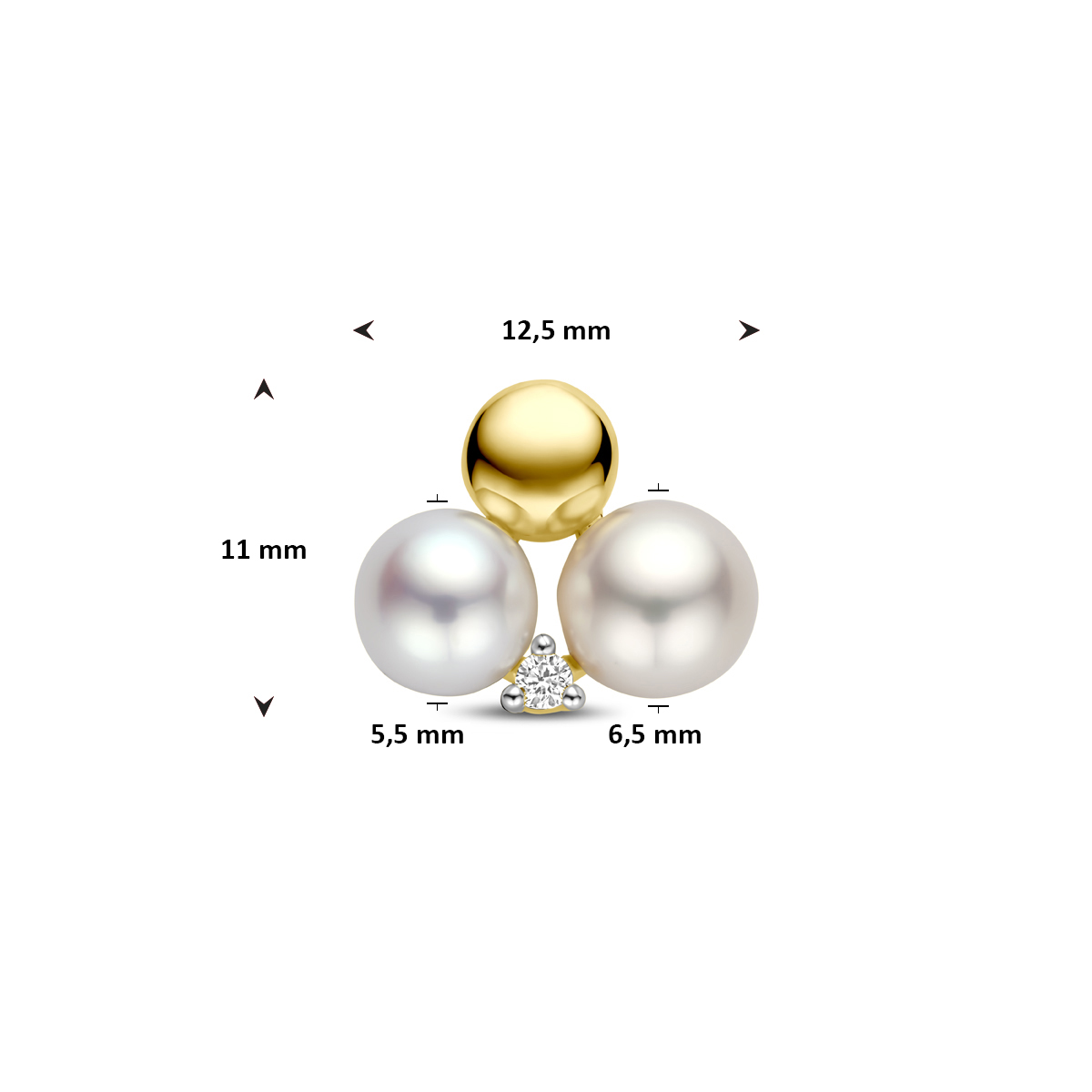 14k Geelgouden hanger uitgevoerd met parels en diamant. De hanger heeft een afmeting van 11x12.5mm. Het totale diamantgewicht is 0.02ct.