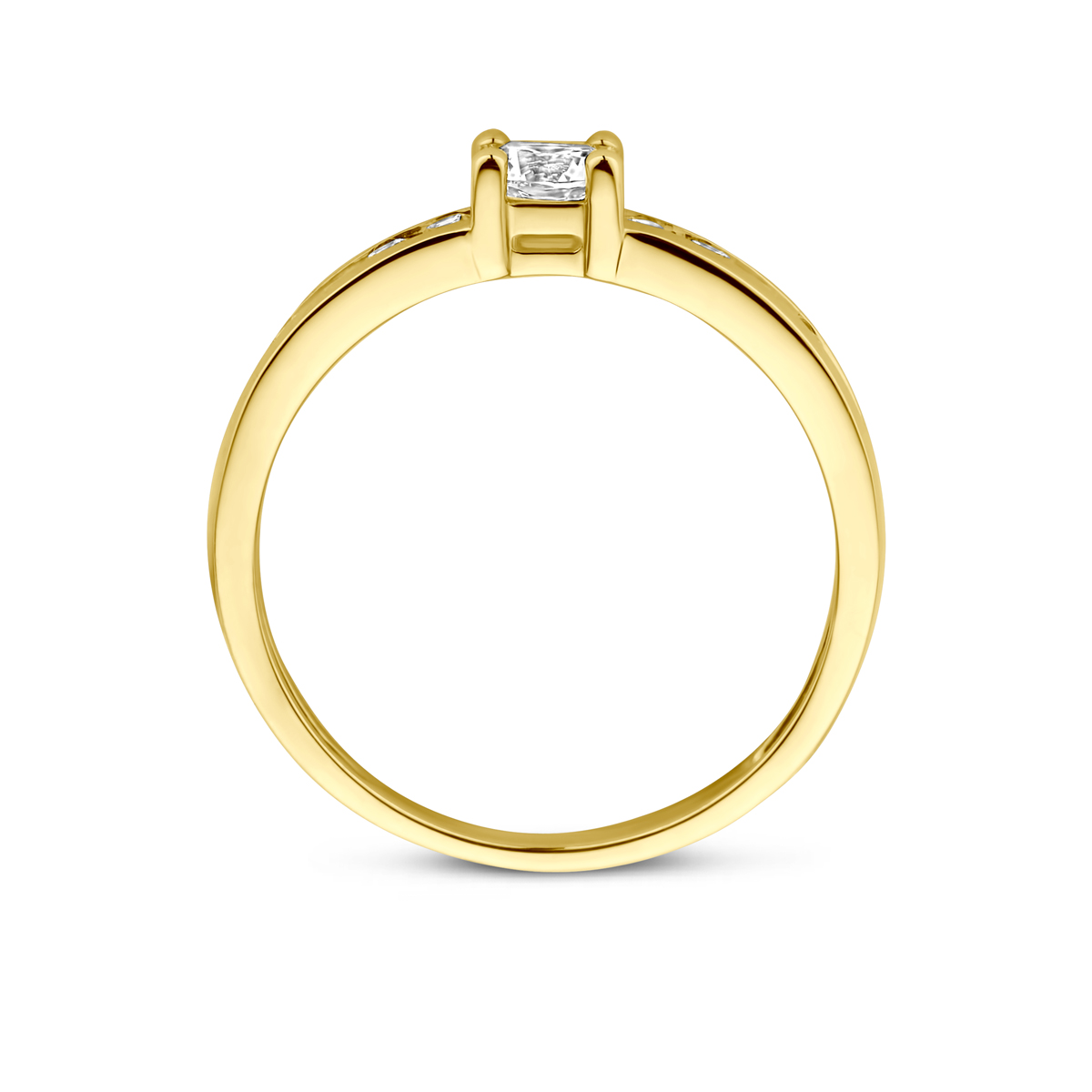 Stijlvolle geelgouden ring met een schitterende rij van zirkonia. Tip: Combineer deze ring met bijpassende sieraden uit onze collectie of vanuit je eigen stash en creeer zo elke keer weer een nieuwe look.