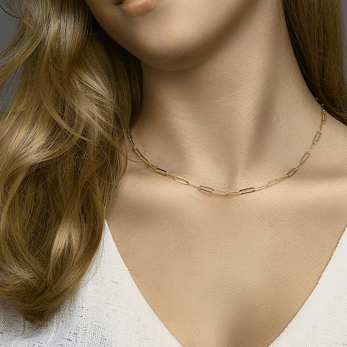 Verguld op 925 zilveren collier met een paperclip schakel en een karabijn sluiting. Het collier heeft een draaglengte van 41cm en een extensie van 4cm. De schakelbreedte is 3.8mm. Geen garantie op plating.
