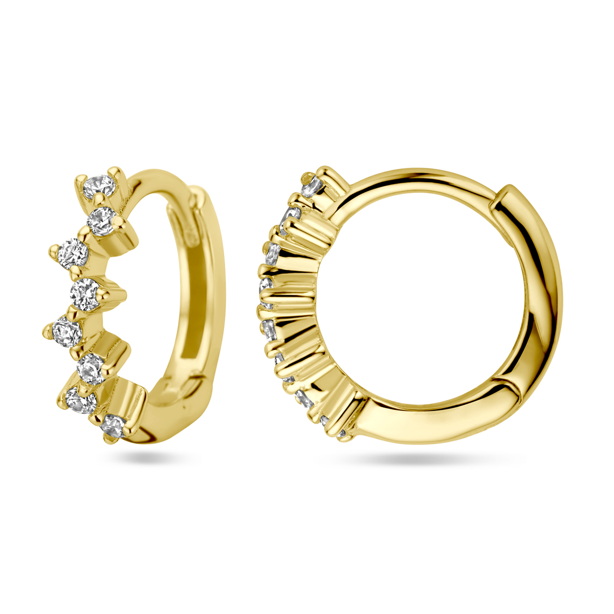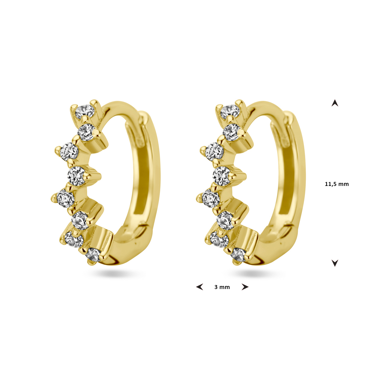 Verguld op 925 zilveren klapoorringen uitgevoerd met zirkonia. De klapoorringen hebben een afmeting van 11.5x3mm. Geen garantie op de plating.