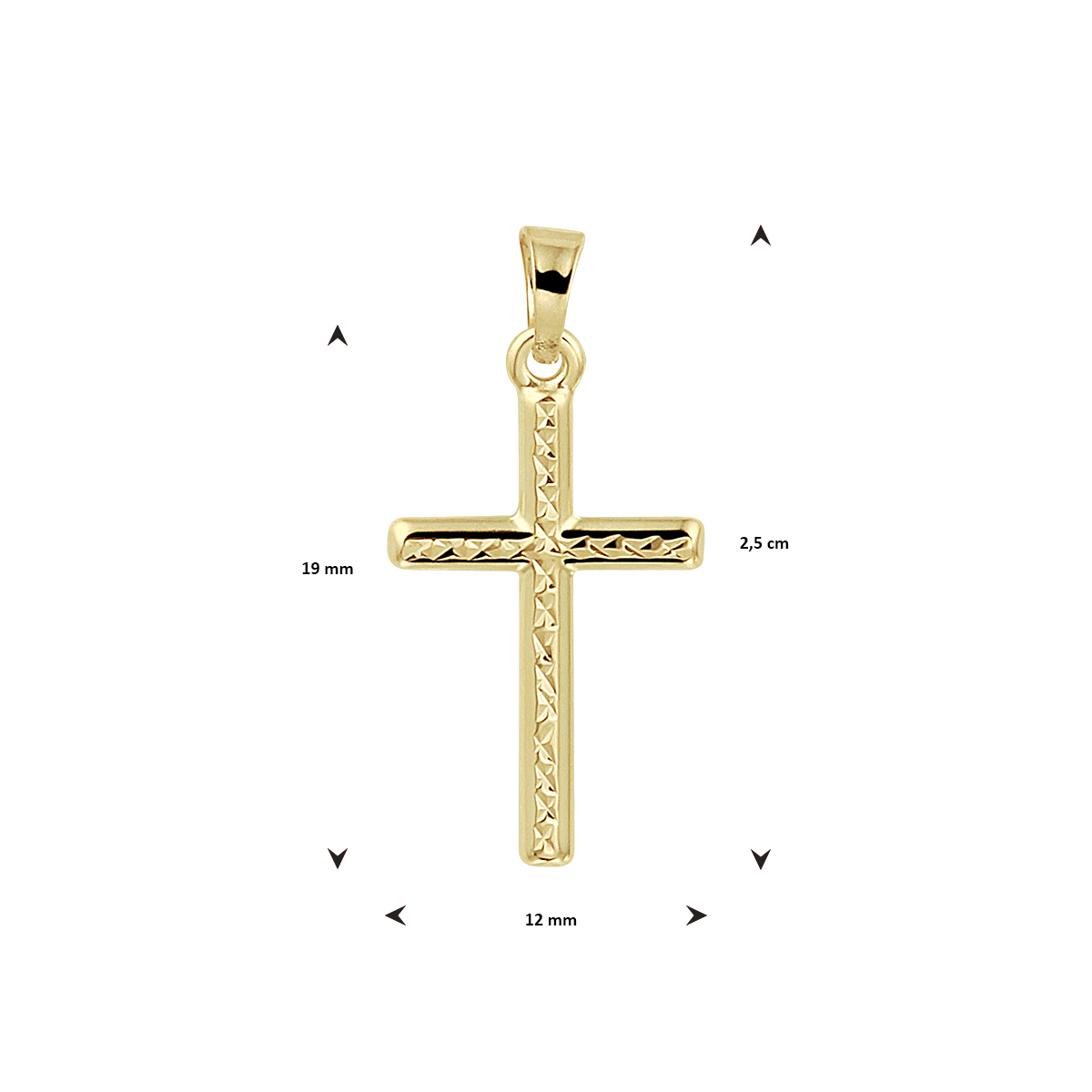 14krt Geelgouden hanger uitgevoerd in de vorm van een kruis en met een gediamanteerde afwerking. De hanger heeft een totale hoogte van 2.5cm en een breedte van 12mm.
