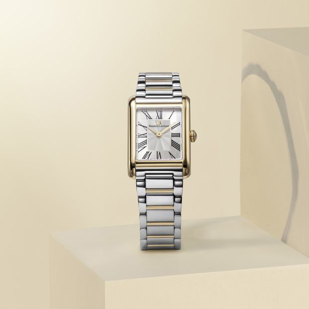 De Maurice Lacroix Fiaba Square Horloge - FA1205-PVY02-110-A is een verfijnd Zwitsers polshorloge met een analoog quartz uurwerk. Het heeft een rechthoekige gouden kast van roestvrij staal, een zilverkleurige wijzerplaat met Romeinse cijfers en saffierglas. Waterbestendig tot 5 ATM. Perfect te dragen bij formele gelegenheden als een elegant accessoire.