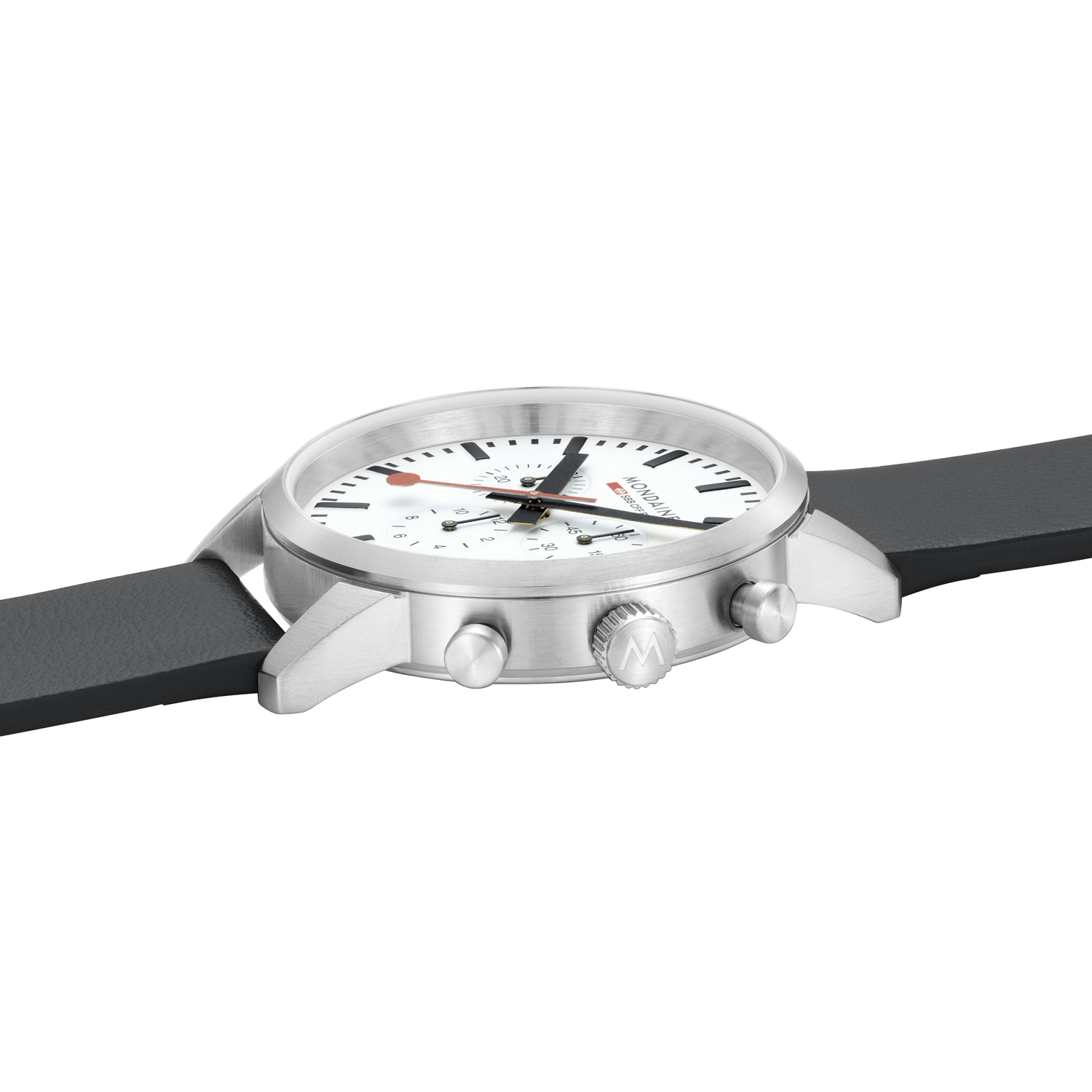 Dit design horloge uit de Mondaine Neo serie heeft een zwarte vegan lederen horlogeband. Het horloge heeft vlak krasvast saffierglas en een ronde geborstelde horlogekast met een kastdiameter van 41mm. Op de zwarte wijzerplaat zijn witte subdails zichtbaar, deze geven de chronograaf weer. Tevens heeft het Swiss Railway horloge een datum. Opvallend is de rode secondewijzer. Maak een statement met dit verfijnde en klassieke uurwerk!