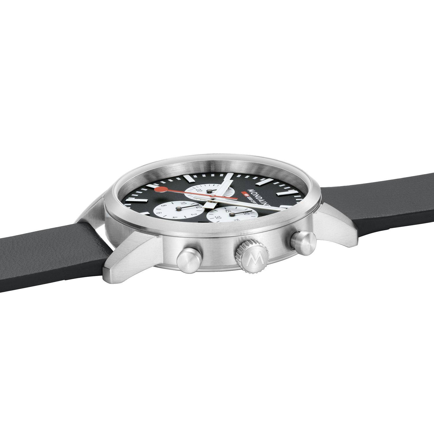 Dit design horloge uit de Mondaine Neo serie heeft een zwarte vegan lederen horlogeband. Het horloge heeft vlak krasvast saffierglas en een ronde geborstelde horlogekast met een kastdiameter van 41mm. Op de witte wijzerplaat zijn witte subdails zichtbaar, deze geven de chronograaf weer. Tevens heeft het Swiss Railway horloge een datum. Opvallend is de rode secondewijzer. Maak een statement met dit verfijnde en klassieke uurwerk!