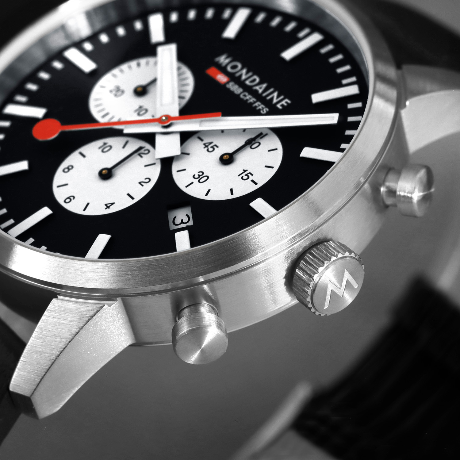 The Official Swiss Railway Watch. Gebaseerd op de officiële stationsklok van de Zwitserse spoorwegen, is 30 jaar geleden de horlogelijn onder het merk Mondaine opgezet. Zwitserse kwaliteitsuurwerken, net zo punctueel als de Zwitserse treinen. Een echte design klassieker met een unieke wijzerplaat, en de wereldberoemde rode secondewijzer met bolletje. Herkenbaar uit duizenden. De Stop2Go is het paradepaardje van Mondaine. De Zwitserse spoorwegen (SBB) staan bekend om hun punctualiteit en dit is te danken aan het principe van het uurwerk: door 58 seconden iets te snel te lopen en 2 seconden stil te staan op de 12, kan iedere Zwitserse trein exact op het hele uur vertrekken. Terwijl de secondewijzer stilstaat, springt de minutenwijzer een streepje verder. De dubbele aandrijving die dit principe mogelijk maakt, vergt meer energie dan andere uurwerken. Daarom is de Stop2Go, die net zo werkt als de stationsklok, uitgerust met een extra sterke batterij die twee jaar mee gaat.