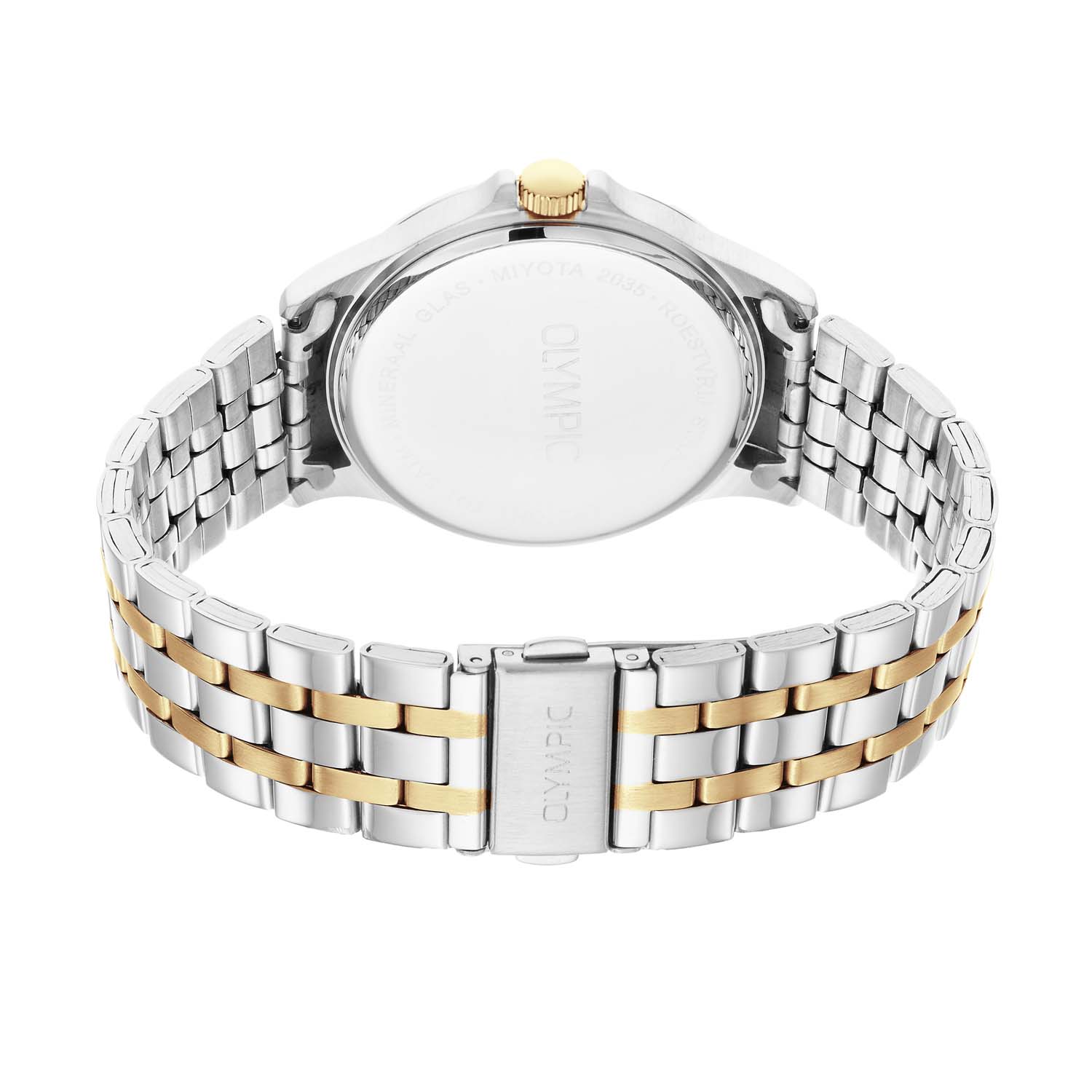 Dit unieke Olympic horloge met artikelnummer: OL72HSS405B is een herenhorloge met een classic sportieve uitstraling. Het horloge heeft een ronde stalen kast met een blauwe wijzerplaat met de 12, streepjes en lumibrite accenten.. Aan de kast zit een bicolor stalen schakelband met vouwsluiting. Het horloge heeft een mineraalglas, een doorsnee van 40mm en is 5ATM.