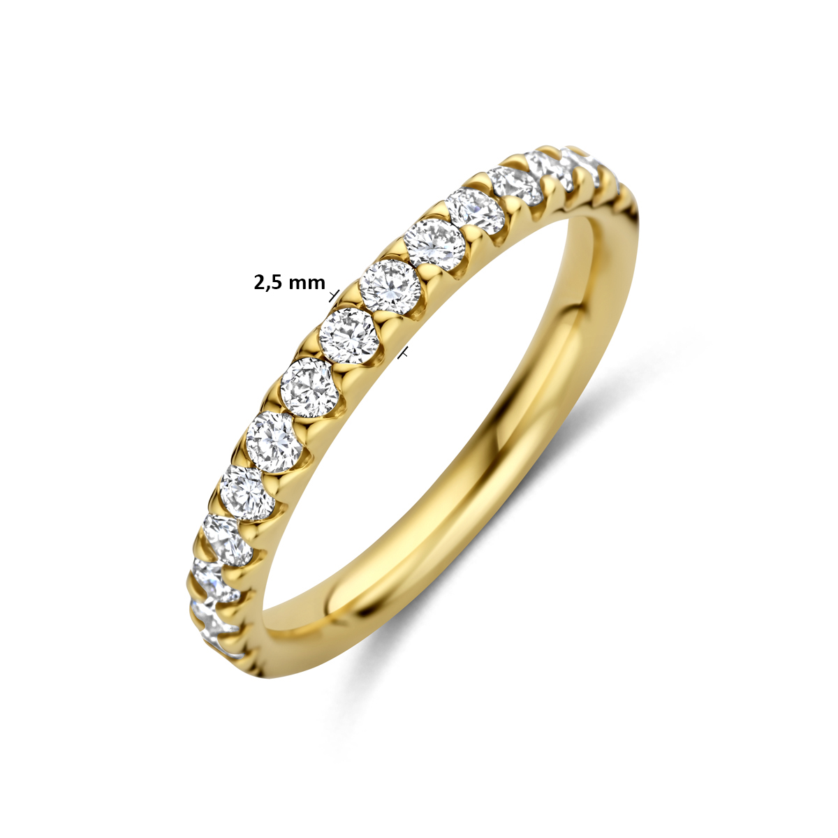 14k Geelgouden ring uitgevoerd met lab grown diamant. De ring heeft een breedte van 2.5mm. Onder extreem hoge druk en temperatuur wordt het natuurlijk ontstaansproces nagebootst met als eindresultaat een diamant met dezelfde chemische eigenschappen maar met een andere oorsprong.