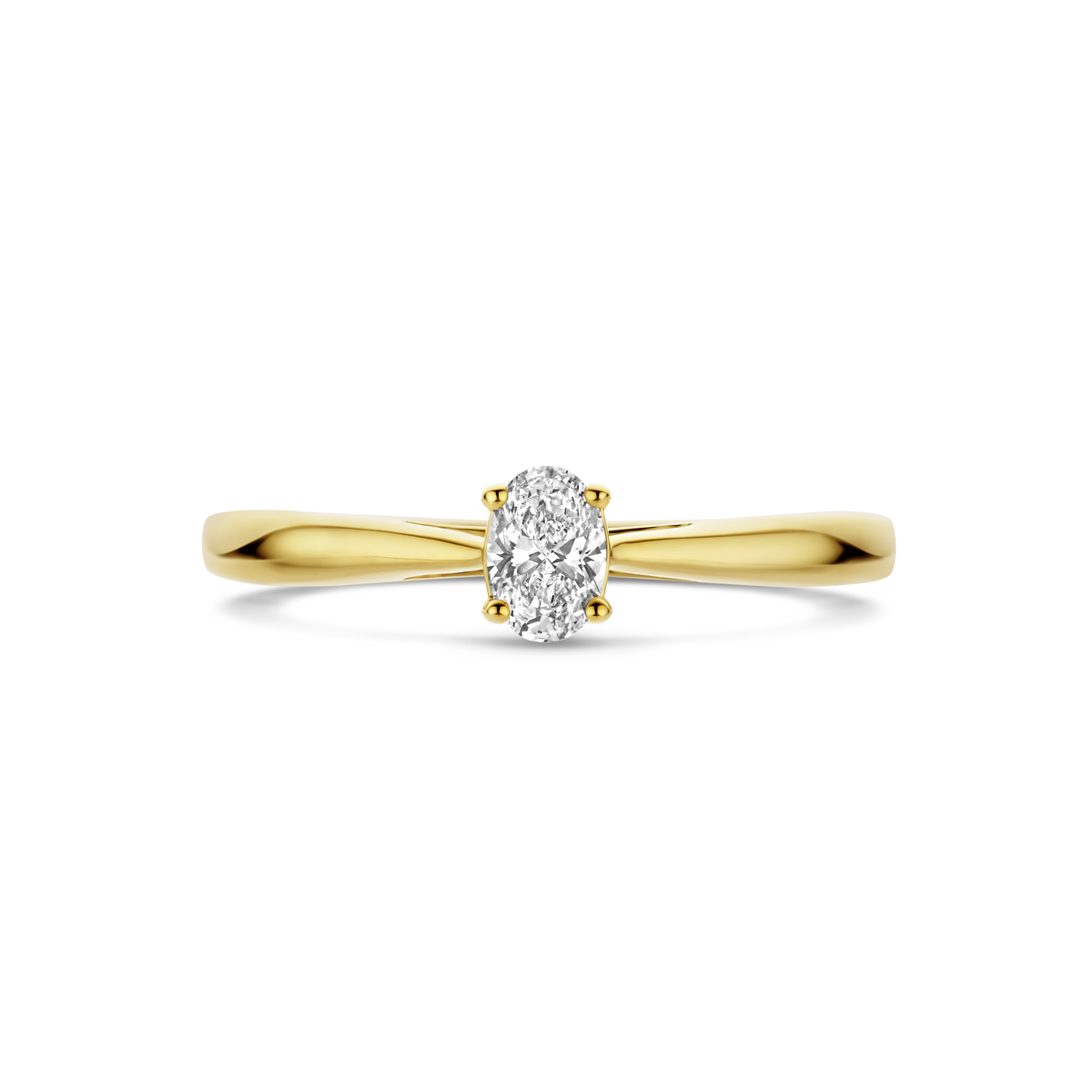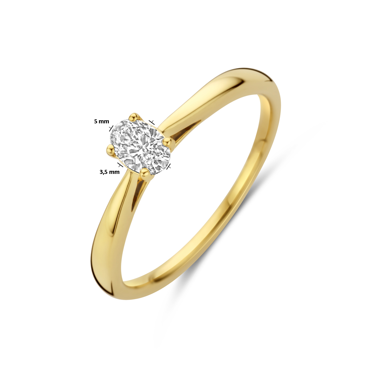 14k Geelgouden ring uitgevoerd met lab grown diamant. De ring heeft een breedte van 5mm. Het diamantgewicht is 0.25ct. Lab grown diamanten zijn diamanten die ontstaan in een laboratorium. Onder extreem hoge druk en temperatuur wordt het natuurlijk ontstaansproces nagebootst met als eindresultaat een diamant met dezelfde chemische eigenschappen maar met een andere oorsprong.