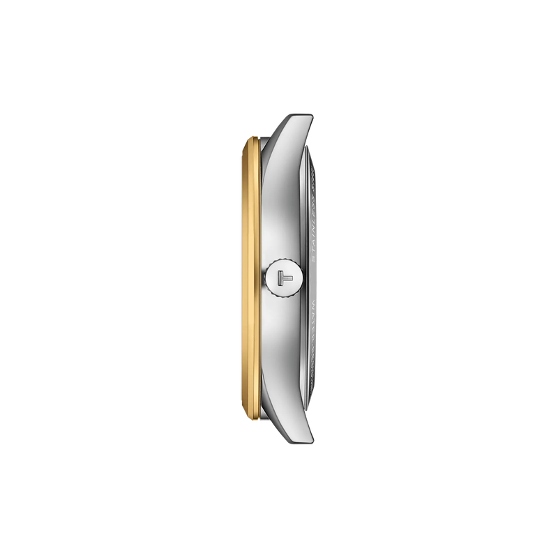 Dit stijlvolle horloge, modelnummer T1584072203100, heeft een metalen kast van 40mm, saffierglas en een waterbestendigheidsniveau van 5 ATM. Het heeft een analoge weergave, een gouden/zilveren kleur en een datumfunctie. Met een automatische beweging en gestreepte wijzerplaat, is het perfect voor dagelijks gebruik. Draag het om je pols voor een elegante uitstraling. Gewicht: 132g. Nieuw.
