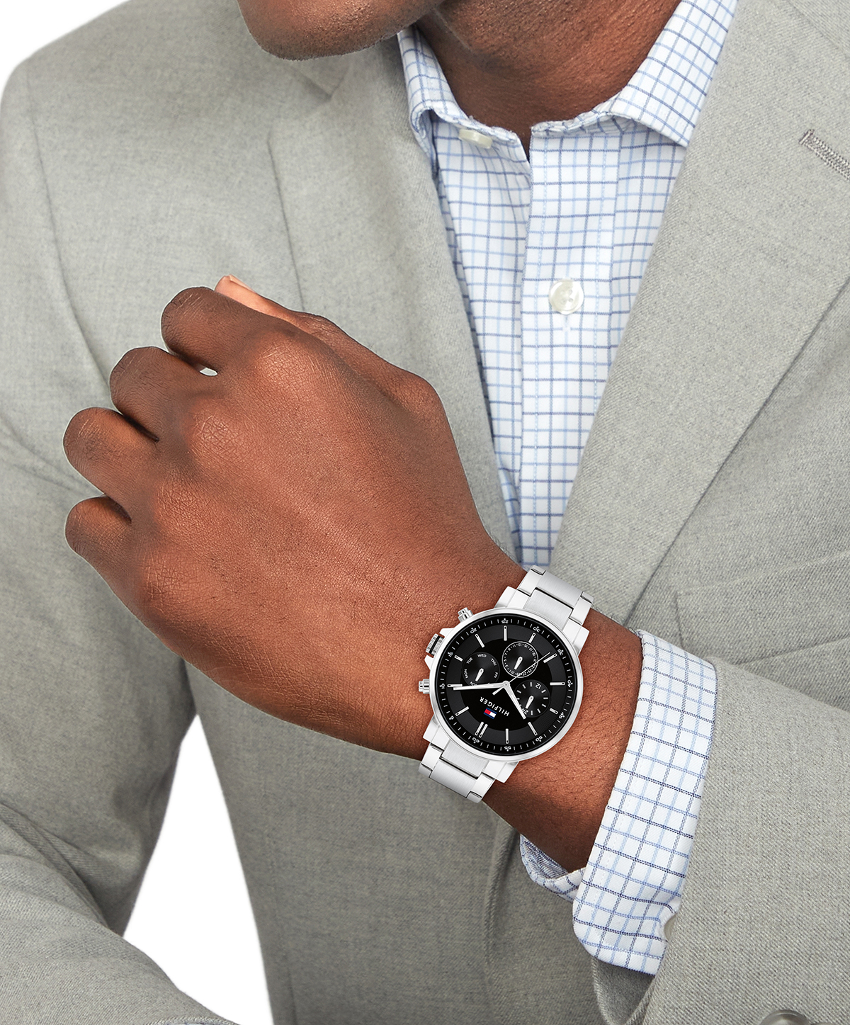 Dit specifieke horloge van Tommy Hilfiger uit de Tyson serie met artikelnr: TH1710667 is een casual herenhorloge die niet in je collectie mag ontbreken. Het stalen herenhorloge heeft een ronde zilverkleurige kast met een gladde bezel en een zwarte wijzerplaat met dag,- datum en 24-uursaanduiding en zilverkleurige wijzers en accenten. De zilverkleurige schakelband is op lengte verstelbaar en heeft een vouwsluiting. Het horloge heeft een mineraalglas, een doorsnee van 44mm en is 5ATM.