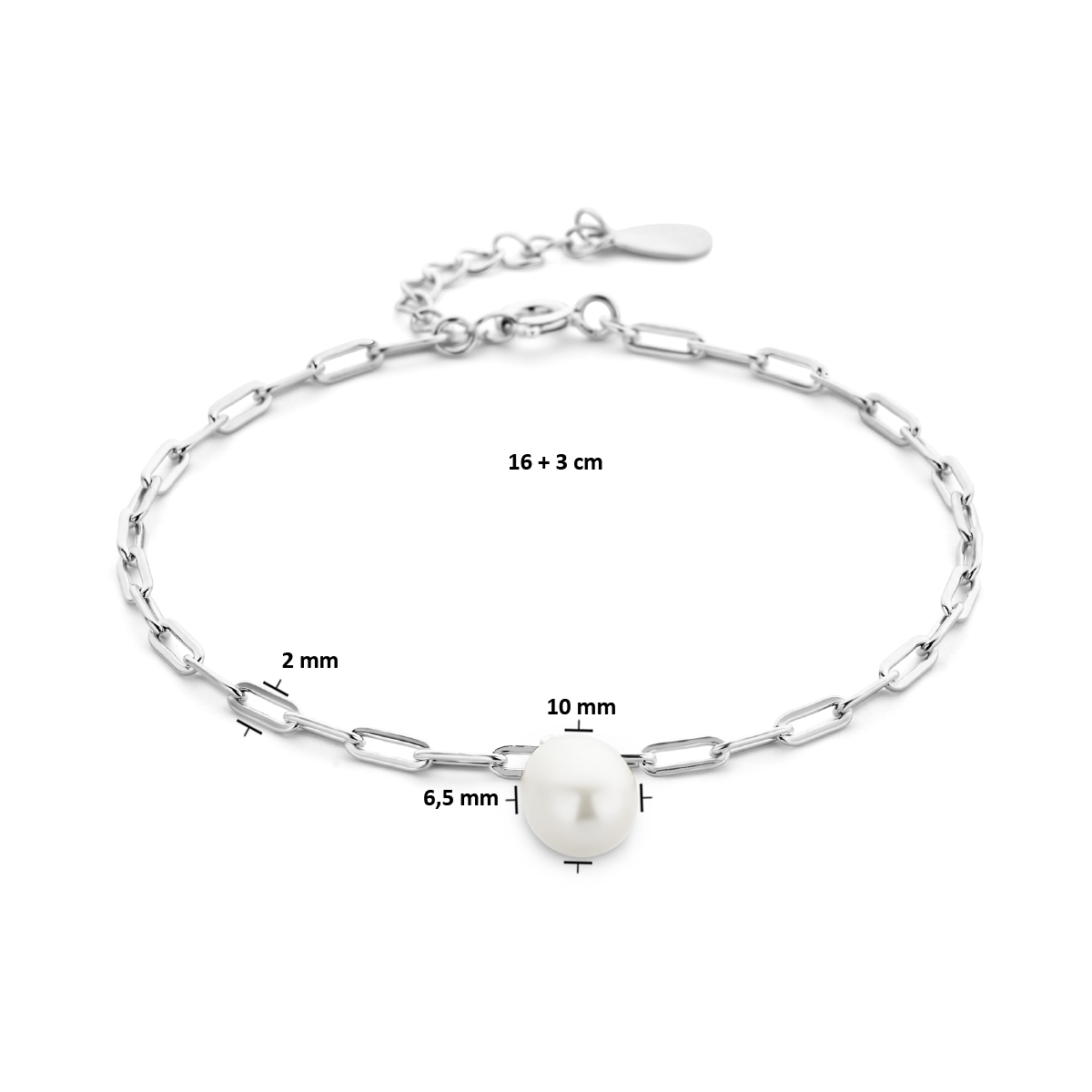 Gerhodineerd 925 zilveren armband uitgevoerd met een zoetwaterparel en een paperclip (platte buis) schakel. De armband heeft een draaglengte van 16cm en een extensie van 3cm. De schakelbreedte is 2mm.