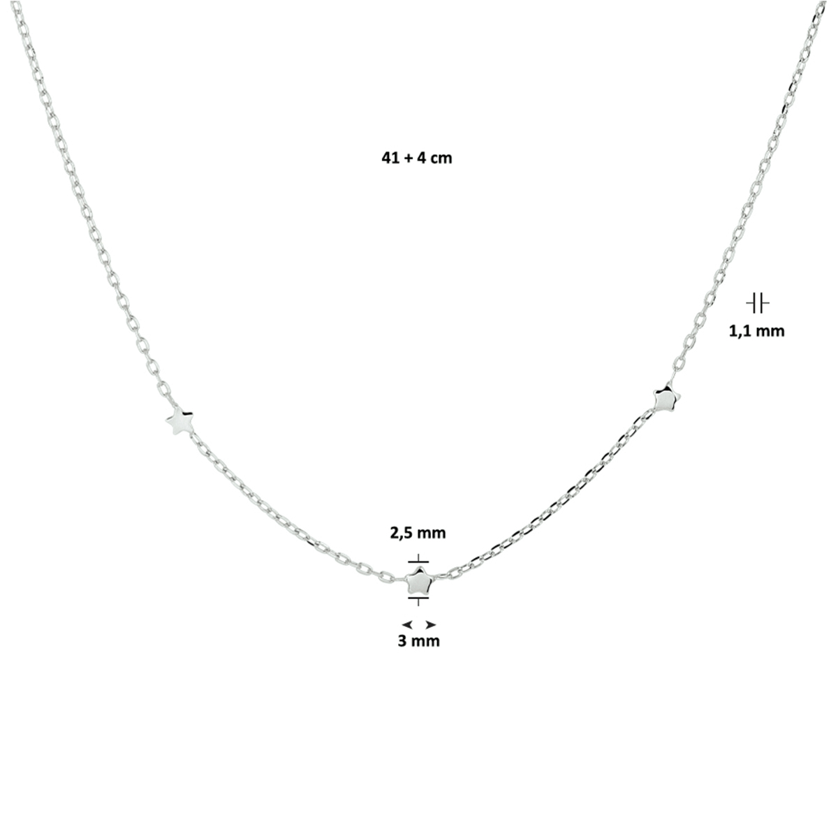 Trendy gerhodineerd zilveren anker collier uitgevoerd met 3 sterren. Door de subtiele uitstraling kan het collier dagelijks gedragen worden en past deze bij veel verschillende outfits. Het collier heeft een draaglengte van 41cm en een extensie van 4cm. De schakelbreedte is 1.1mm.