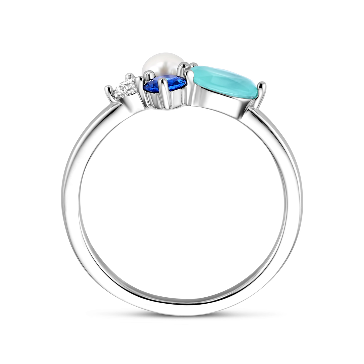 Gerhodineerd 925 zilveren ring uitgevoerd met gekleurd zirkonia, glas kleursteen en een zoetwaterparel. De ring heeft een breedte van 8mm.