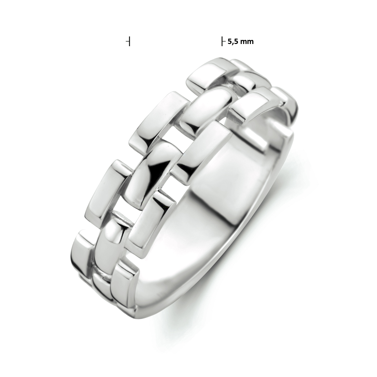 Gerhodineerd 925 zilveren ring uitgevoerd met schakelmotief. De ring heeft een breedte van 5.5mm.