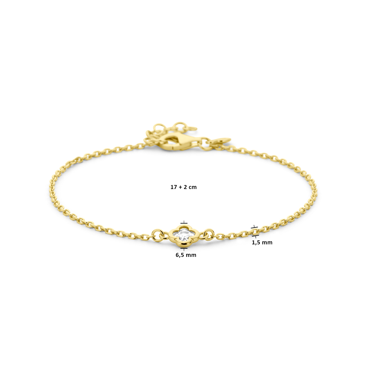 Geelgoud op 925 zilveren armband uitgevoerd met een bloem en zirkonia. De armband heeft een draaglengte van 17cm met 2cm extensie. Uitgevoerd met karabijn sluiting. De schakelbreedte is 1.5mm.  Geen garantie op de plating.